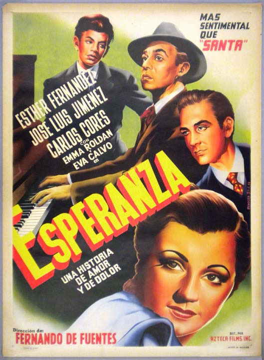 Colorful Mexican movie poster has super artwork picturing all the main stars, one of whom is playing the piano... The film starred Esther Fernandez, Jose Luis Jimenez, Carlos Cores, Emma Roldan and Eva Calvo. (Rolled) $125 |