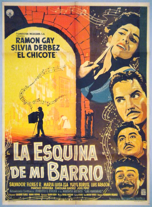 Interesting Mexican musical movie poster has a nice design and good images of the main stars... The film starred Ramon Gay, Silvia Derbez, Armando Soto La Marina 'El Chicote' and Salvador Flores. $45 |