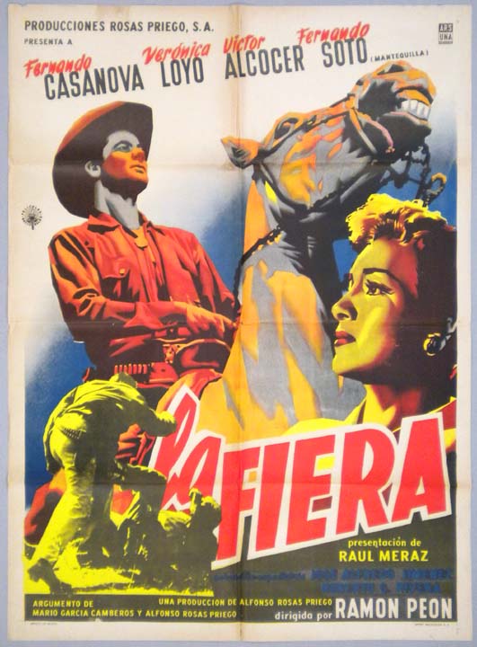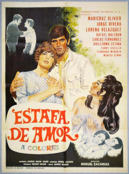 Attractive Mexican movie poster pictures Mexican beefcake star Rivero, holding the starry-eyed Olivie, as an unhappy looking Lorena Velazquez looks on... The film starred Jorge Rivero, Maricruz Olivier, Lorena Velazquez and Rafael Baledon. $45 |