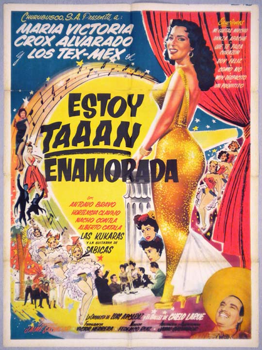 Beautiful Mexican musical comedy movie poster features nice colors and a great image of the sexy Ms. Victoria. Average signs of use -- no major problems... The film starred Maria Victoria, Crox Alvarado, Antonio Bravo, Hortensia Clavijo and los Tex Mex. $65 |