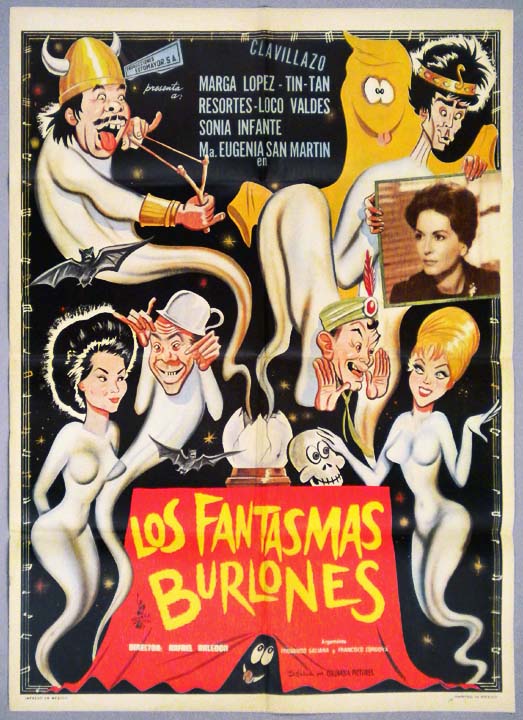 Beautiful Mexican comedy movie poster combines humor with horror, to good effect. The onesheet features caricatures of some of the biggest names in Mexican comedy -- in the form of ghosts -- surrounded by some sexy female ghosts. A classic!!!... The film starred Antonio 'Clavillazo' Espino, German 'Tin-Tan' Valdes, Adalberto 'Resortes' Martinez, Manuel 'Loco' Valdes, Maria Eugenia San Martin, Sonia Infante, Maria Victoria and Marga Lopez. $125 |