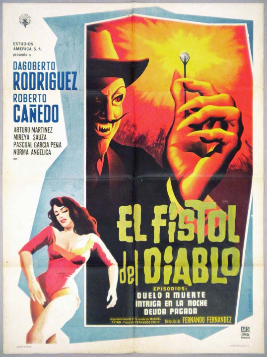 Gorgeous Mexican horror / crime movie poster features a superb image of a demonic villain, plus a smaller image of a sexy femme fatale... The film starred David Silva, Roberto Canedo, Jorge Fernandez, Nora Veryan and Patricia Nieto. $95 |