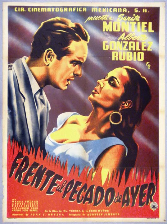 Stunning Mexican movie poster features great color and wonderful portraits of the two main stars -- Montiel and Gonzalez Rubio. Beautiful!... The film starred Sara Montiel, Alberto Gonzalez Rubio, Magda Guzman, Andres Soler and Alejandro Lugo. (This poster was at one folded, but it has been stored flat for quite a while, so it will be sent rolled.) $195 |