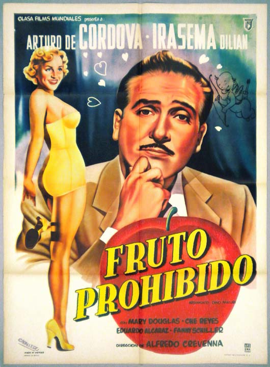 De Cordova contemplates his "prohibited fruit" -- in this case -- the scantily-clad Ms. Dilian wearing a sexy bathing suit. Amusing and colorful Mexican comedy movie poster... The film starred Arturo de Cordova, Irasema Dilian, Maria Douglas, Jorge Che Reyes and Fanny Schiller. $55 |