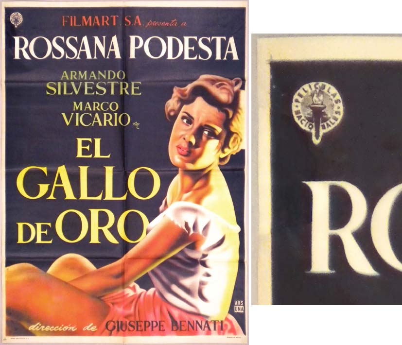 WOW! This Mexico / Italian co-production featured Rosanna Podesta in her second Mexican film role, after her appearance in La Red. This Mexican movie poster has a superb image of the sexy actress. There is a repaired chip that entered into the back background area at the upper left corner. However, this repair is not very distracting and it does not affect the main image. Otherwise, the poster is clean and bright. Beautiful onesheet!... The film starred Armando Silvestre, Marco Vicario, Mara Berni and Giorgia Moll. $65 |