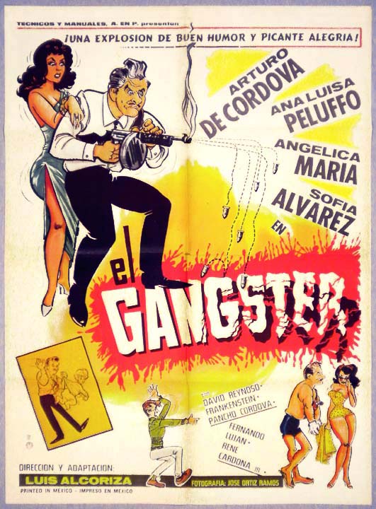 Colorful Mexican comedy / crime movie poster has a nice montage of images, including a machine gun totting de Cordova and his sexy moll, Peluffo... The film starred Arturo de Cordova, Ana Luisa Peluffo, Angelica Maria and Sofia Alvarez. $45 |