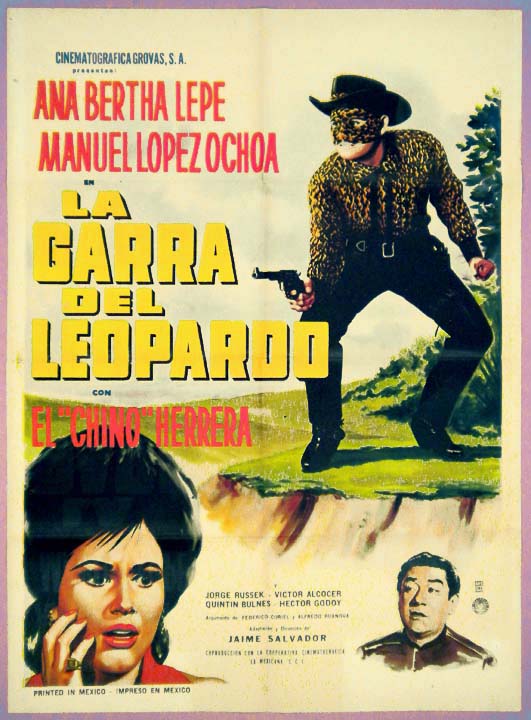 This memorable Mexican western movie poster features a masked cowboy wearing an outfit you might be more likely to find in the lucha libre ring, a leopard skin mask and vest! A colorful classic!... The film starred Ana Bertha Lepe, Manuel Lopez Ochoa, Daniel 'Chino' Herrera and Jorge Russek. $85 |