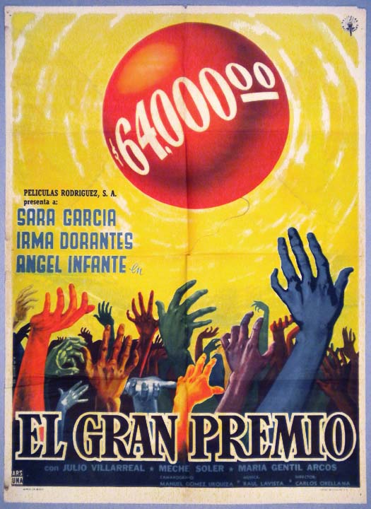 Impressive Mexican film poster with a memorable design -- numerous hands reaching toward a balloon. It appears that this poster got damp / wet at some point and some light water damage has resulted. This occurs mainly along the yellow background areas on the upper half. However, these water marks are not terribly distracting -- and otherwise -- the colors are bright and the onesheet is quite presentable!... The film starred Sara Garcia, Irma Dorantes, Angel Infante and Julio Villarreal. $65 |