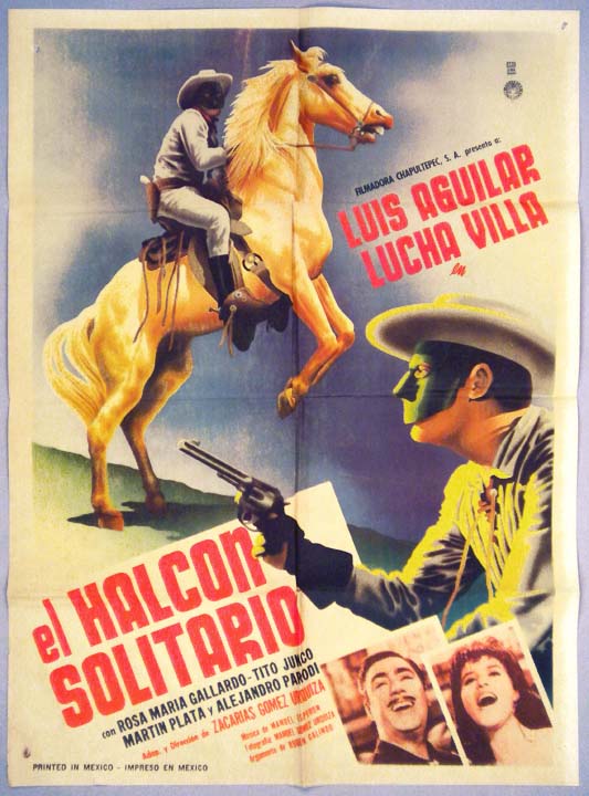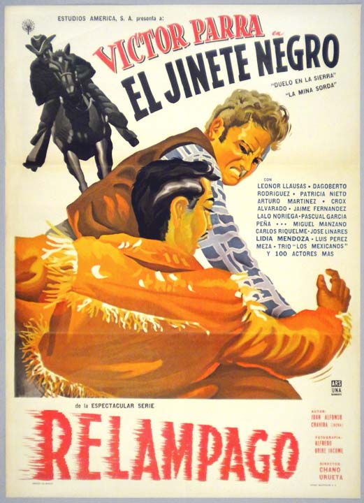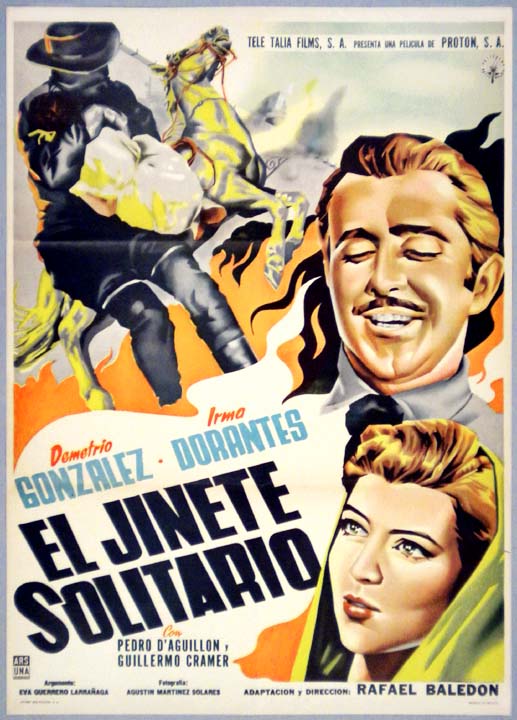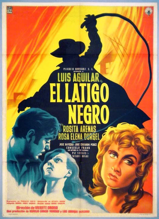 One of the classic Mexican western movie posters pictures the Zorro like hero in silhouette -- wielding a whip. The film starred Luis Aguilar, Rosita Arenas, Rosa Elena Durgel, Federico Curiel and Jose Baviera. $150 |