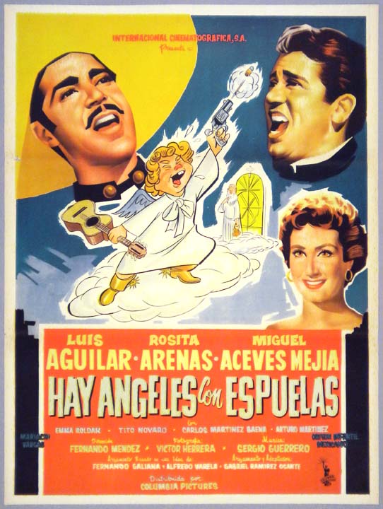 Colorful Mexican western / comedy movie poster features great images of the three main stars... The film starred Luis Aguilar, Rosa Arenas, Miguel Aceves Mejia, Emma Roldan and Arturo Martinez. (This poster has only limited, very mild fold lines -- so it will be sent rolled.) $45 |
