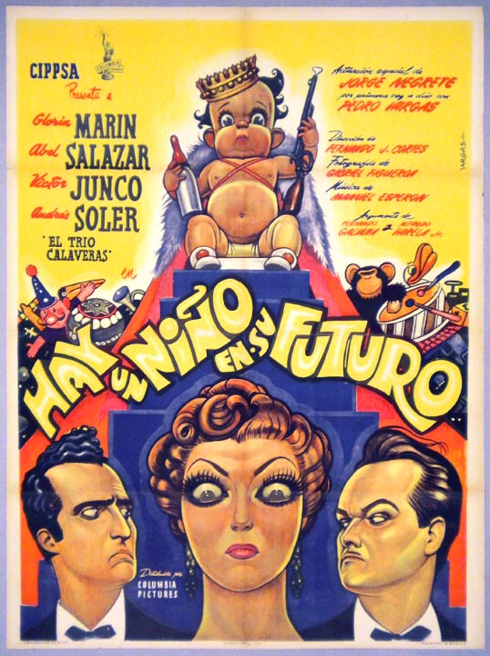 Wonderful Mexican comedy movie poster shows three young adults, who are at the mercy of their tyrannical infant. During an interview, Ernesto Garcia Cabral Jr. stated that his father contributed to the art work on this poster, and he remembered watching his father at work on it. The three portraits along the bottom certainly have his father's style and it is known that Cabral did collaborate with other artists on other posters. The onesheet is signed by Vargas, but we believe it is likely that Cabral did collaborate in creating this classic poster... The film starred Gloria Marin, Abel Salazar, Victor Junco, Andres Soler, Pedro Vargas and Pompin Iglesias. $225 |