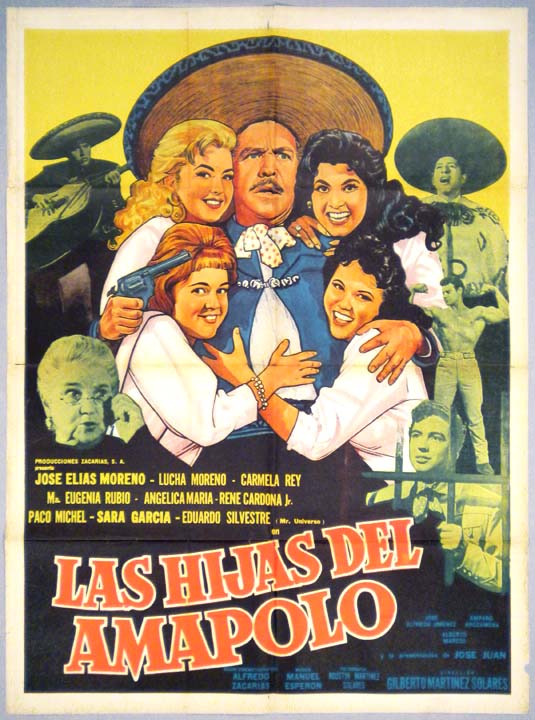 Colorful Mexican ranchera / musical movie poster with a heartwarming image of Jose Elias Moreno being embraced by his four daughters... The film starred Jose Elias Moreno, Lucha Moreno, Carmela Rey, Maria Eugenia Rubio and Angelica Maria. $55 |