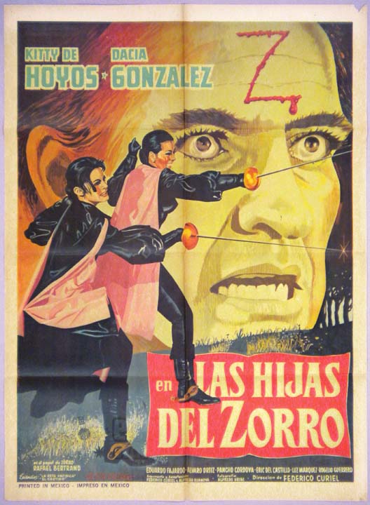 Companion film to "Hijas del Zorro," both films were inspired by the legend of Zorro. This Mexican movie poster features nice close-up images of two pretty, female stars... The film starred Kitty de Hoyos, Dacia Gonzalez, Dagoberto Rodriguez, Eduardo Fajardo and Eric del Castillo. $55 |