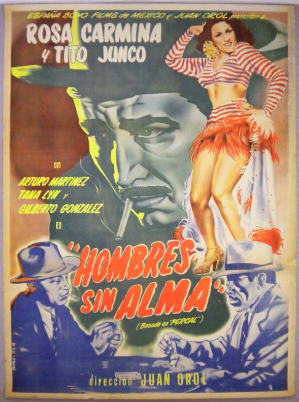 Superb Mexican crime movie poster showcases standard film noir trappings -- some tough looking thugs and a sexy femme fatale! There was some wear along the right side border -- tears, edge wear, small border chips -- which have been repaired using paper from another vintage poster. These repairs are not too noticeable, and they do greatly not affect the lovely image area. The poster will display beautifully... The film starred Rosa Carmina, Tito Junco, Arturo Martinez, Tana Lynn and Gilberto Gonzalez. (Rolled) $165 |
