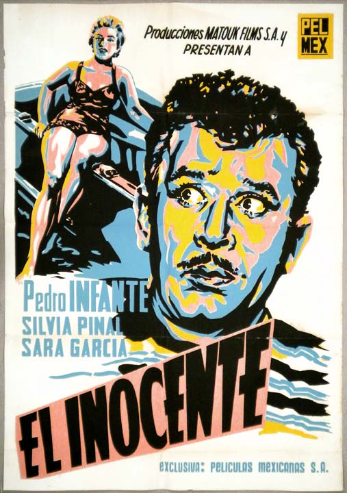 Striking Mexican comedy movie poster has a great close-up image of beloved actor, Infante, who is gazing sheepishly towards the sexy Ms. Pinal. This is a 'screen' style poster, rather than a typical printed poster... This movie starred Pedro Infante, Silvia Pinal, Sara Garcia and Oscar Ortiz de Pinedo. $35 |