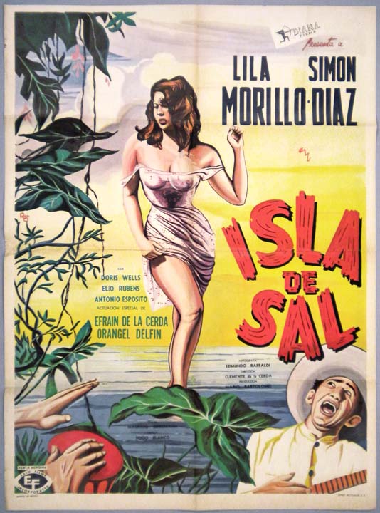 Alluring Mexican movie poster from an early Venezuelan film. The onesheet features a sexy image of a sultry femme fatale standing on the beach. There is some wear /repairs along the fold lines, but these are not very noticeable. The poster will still display very well... The film starred Lila Morillo, Simon Diaz, Doris Wells and Orangel Delfin. $85 |