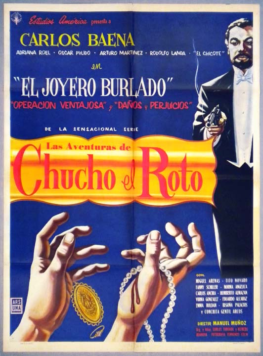 Appealing Mexican crime movie poster has nice color and stylish art work -- including bleeding hands holding stolen jewelry. Part of the popular adventure series, Chucho el Roto... The film starred Carlos Baena, Adriana Roel, Oscar Pulido, Arturo Martinez and Rodolfo Landa. $55 |