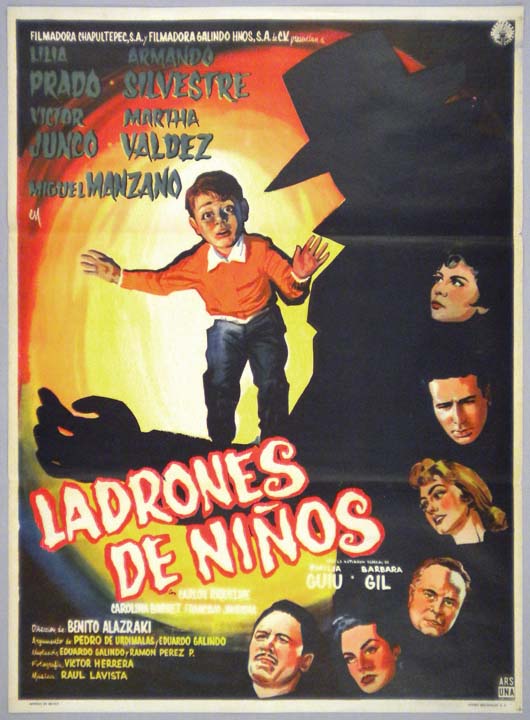 Striking Mexican movie poster features a frightened child being menaced by a shadowy figure. Nice color... The film starred Lilia Prado, Armando Silvestre, Victor Junco and Martha Valdes. (This poster has limited fold lines and will be sent rolled.) $45 |
