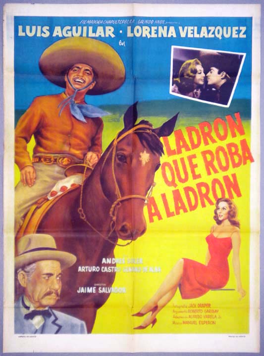 Colorful Mexican ranchera / musical / comedy movie poster pictures Luis Aguilar on horseback, and features a sexy image of Lorena Velazquez in a red dress... The film starred Luis Aguilar, Lorena Velazquez, Andres Soler and Arturo 'Bigoton' Castro. $65 |
