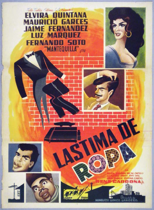 Colorful Mexican comedy movie poster features striking caricatures of the stars and stylized images from the film. Light edge wear on the right side border, but otherwise, it is in great shape... The film starred Elvira Quintana, Mauricio Garces, Jaime Fernandez, Luz Marquez and Fernando 'Mantequilla' Soto. (This poster has only limited, very mild fold lines -- so it will be sent rolled.) $65 |