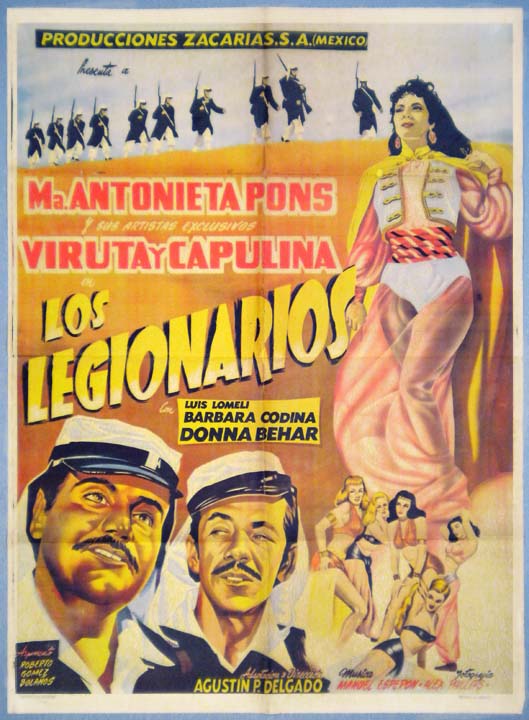 Attractive comedy film poster featuring the Abbott and Costello like team of Viruta y Capulina. This time, they have joined the Foreign Legion and are surrounded by sexy women. The poster has general wear and the fold lines have been partially reinforced on the back with acid-free, archival tape, but this is not visible on the front... The film starred Marco Antonio Campos'Viruta,' Gaspar Henaine 'Capulina,' Maria Antonieta Pons and Luis Lomeli. $45 |