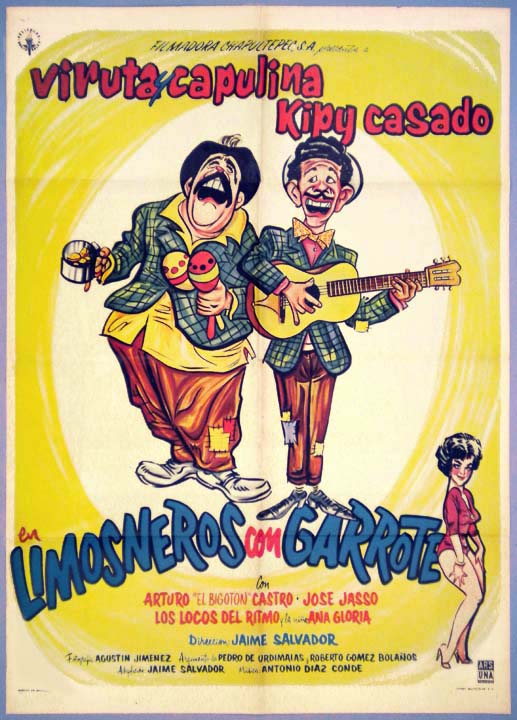 Another colorful Mexican Viruta y Capulina comedy movie poster -- this time, they are pictured as street musicians. Nice art work!... The film starred Marco Antonio Campos 'Viruta,' Gaspar Henaine 'Capulina,' Kippy Casado and Carlos Agosti. $75 |