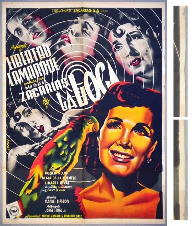 Beautiful Mexican movie poster has striking images of several of the stars -- including the lovely Ms. Carmina. There are some tears, chips, repairs and wear along the borders, but this wear does not detract from the beautiful main image area. The colors are bright and the poster will display beautifully... The film starred Rosa Carmina, Arturo Soto Rangel, Beatriz Ramos, Luis Lopez Somoza and Jorge Mondragon. (Rolled) $150 |