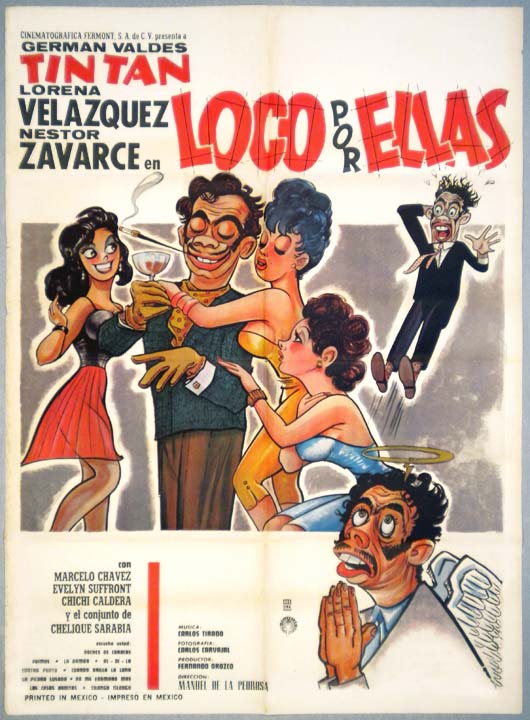 Colorful Mexican comedy movie poster pictures playboy 'Tin Tan' surrounded by sexy women, as an angelic 'Tin Tan' prays for his mortal soul!... The film starred German 'Tin Tan' Valdes, Lorena Velazquez, Nestor Zavarce and Marcelo Chavez. $65 |