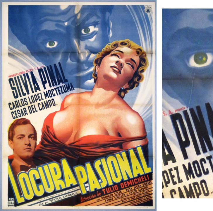 Striking Mexican movie poster with many classic film noir elements -- including a pair of sinister eyes staring at the sexy Ms. Pinal. There is a mild printing crease on the blue background area, but this minor flaw is not very noticeable. Otherwise, the onesheet is clean and bright... The film starred Silvia Pinal, Carlos Lopez Moctezuma, Cesar del Campo and Domingo Soler. $125 |