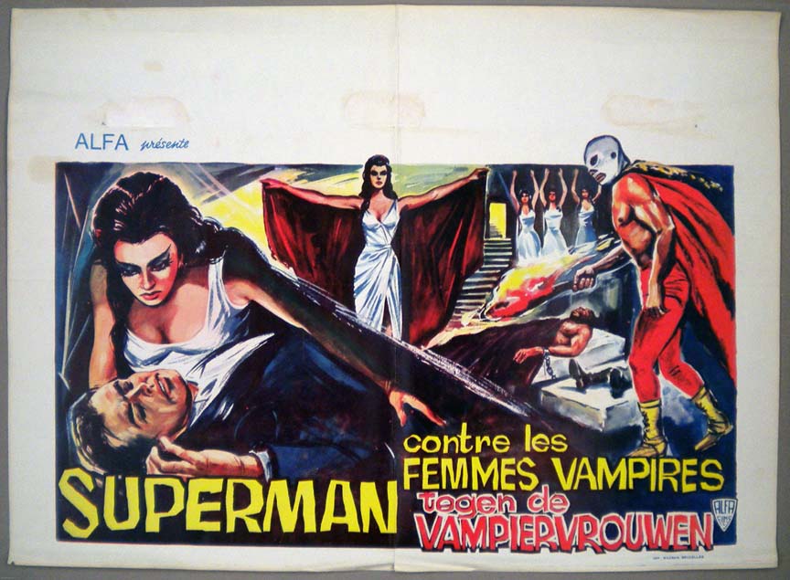 Another great horror / lucha libre film poster with atmospheric artwork and great images of both the hero and the beautiful female monsters. This one is an original Belgian window card. Santo's most famous film -- a true surreal classic! The film was released in the USA as, Samson vs. the Vampire Women. Light edge/border wear, but there are no major problems and it will display beautifully... The film starred El Santo, Lorena Velazquez, Jaime Fernandez, Maria Duval and Ofelia Montesco. $85 |