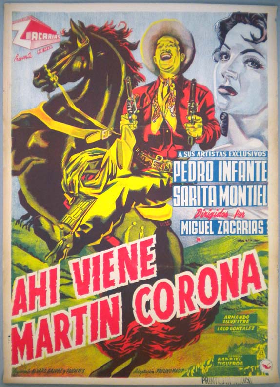 Classic western / ranchera film poster has a fantastic image of Pedro Infante on horseback, belting out a song while gripping 6-guns in both hands. This poster was produced using the intricate silkscreen process. The poster has some wear along the outside borders -- tears, edge wear and repaired chips -- but these flaws do not detract from the beautiful image area. It will display beautifully... This movie starred Pedro Infante, Sara Montiel, Eulalio 'Piporro' Gonzalez and Armando Silvestre. $265 |
