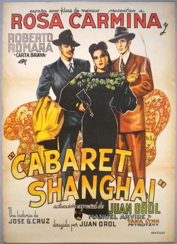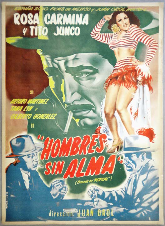 Superb Mexican crime movie poster showcases standard film noir trappings -- some tough looking thugs and a sexy femme fatale! There was some wear along the right side border which has been repaired using paper from another vintage poster. This flaw is not too noticeable, and it does not affect the lovely image area. The poster will display beautifully ... The film starred Rosa Carmina, Tito Junco, Arturo Martinez, Tana Lynn and Gilberto Gonzalez. (Rolled) $195 |