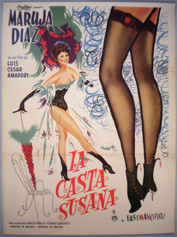 Colorful comedy film poster features wonderful showgirl art -- with a pair of legs that never end! There was a printing flaw at the upper right resulting in an extra flap of paper at this corner, but this minor flaw does not affect the beautiful graphics. Otherwise, the onesheet is in great shape and it will display beautifully... This Spanish movie starred Maruja Diaz, Isabel Garces, Carlos Estrada, Rafael Alonso and Manuel Gil. (This poster has only limited, very mild fold lines -- so it will be sent rolled.) $55 |