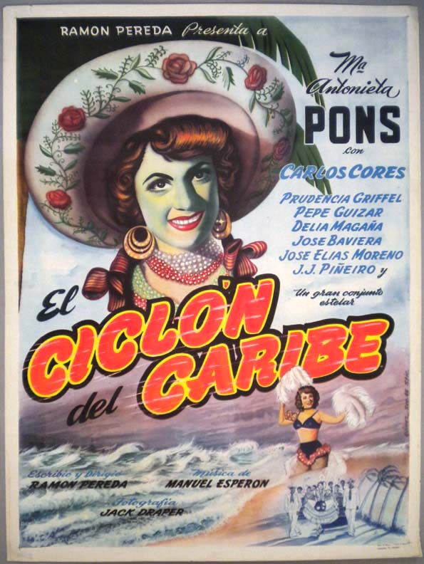Impressive Mexican musical film poster with a gorgeous central image of Ms. Pons. This poster s among the most vibrantly colored of the golden era of Mexican cinema. There is some border wear -- repaired chips and small tears -- but these flaws do not greatly detract from the striking image area. The colors are clean and bright and the onesheet will display beautifully... This movie starred Maria Antonieta Pons, Carlos Cores, Prudencia Grifell, Pepe Guizar and Jose Elias Moreno. (Rolled) $250 |