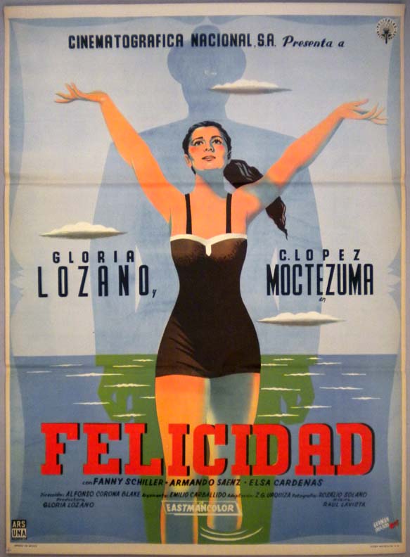 Gorgeous Mexican movie poster is both striking and vibrant -- with a central image of Ms. Lozano in a swimsuit. One of the classic posters of the golden era of Mexican cinema. This movie starred Gloria Lozano, Carlos Lopez Moctezuma, Fanny Schiller, Armando Saenz and Elsa Cardenas. (This poster has only limited, very mild fold lines -- so it will be sent rolled.) $295 |