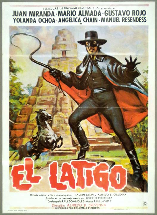 Attractive Mexican western movie poster has a great central image of Miranda as the Zorro like masked hero... The film starred Juan Miranda, Angelica Chain, Mario Aldama and Gustavo Rojo. $75 |