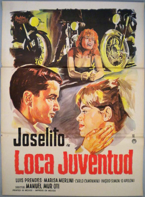 Dramatic Mexican JD / bad girl film poster with a great montage of images, including some bikers, a young couple, plus a girl expressing emotional turmoil... This movie starred Joselito, Luis Prendes, Marisa Merlini and Carlo Campanini. (This poster has only limited, very mild fold lines -- so it will be sent rolled.) $55 |