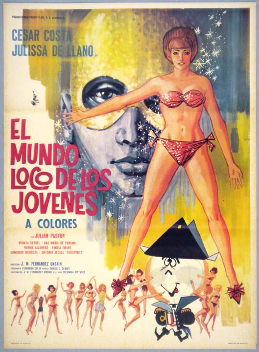 Colorful Mexican comedy movie poster has a mod 1960s design. The art work features images of sexy Julissa, some bikini clad babes, plus a mysterious masked singer... The film starred Julissa, Cesar Costa, Julian Pastor and Renata Seydel. (This poster has only limited, very mild fold lines -- so it will be sent rolled.) $85 |