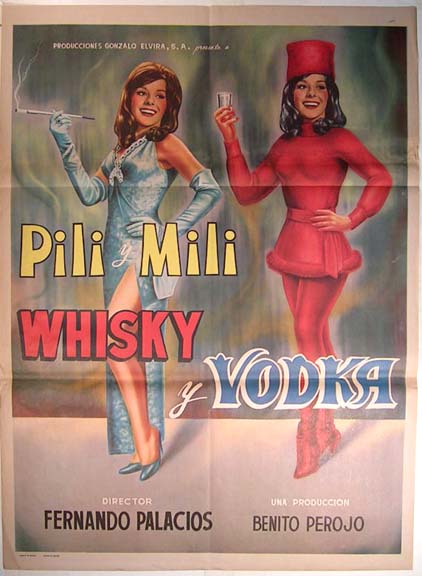 Charming Mexican movie poster from a Spanish comedy film. The onesheet features a great image of the comedy team -- and real life twin sisters -- Pili and Mili. Elegant and colorful! The perfect poster to decorate a bar or tavern! The colors are bright and the poster displays beautifully... The film starred Pilar Bayona, Emilia Bayona, Rafael Alonso and Roberto Camardiel. (This poster has limited fold lines and will be sent rolled.) $295 |