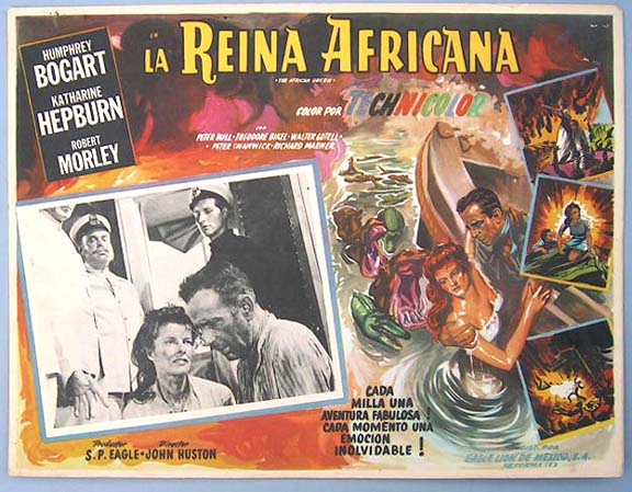 Beautiful Mexican jumbo lobby card (12.5x16.5") from the 1951 United Artists adventure / romance film, THE AFRICAN QUEEN, which starred Humphrey Bogart, Katharine Hepburn, Robert Morley and Peter Bull. $35 |