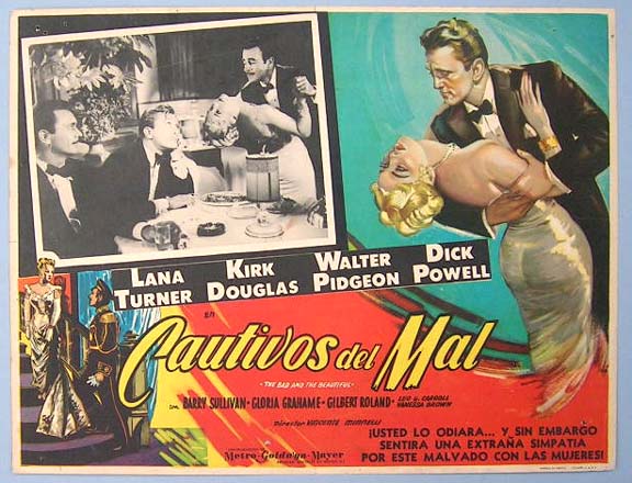 Beautiful Mexican jumbo lobby card (12.5x16.5") from the 1952 MGM romance film, THE BAD AND THE BEAUTIFUL, which starred Lana Turner, Kirk Douglas, Walter Pidgeon, Dick Powell, Barry Sullivan, Gloria Grahame, and Gilbert Roland. $25 each |
