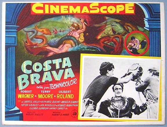 Beautiful Mexican jumbo lobby card (12.5x16.5") from the 1953 20th Century Fox adventure / romance / deep sea diving film, BENEATH THE 12-MILE REEF, which starred Robert Wagner, Terry Moore, Gilbert Roland, J. Carrol Naish and Richard Boone. $25 each |
