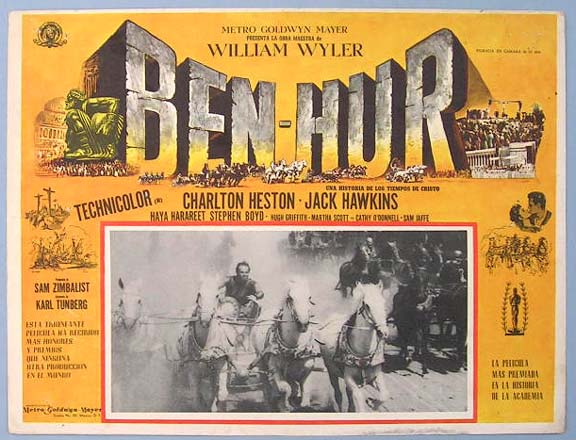 Beautiful Mexican jumbo lobby card (12.5x16.5") from the 1959 MGM Biblical film, BEN-HUR, which starred Charlton Heston, Jack Hawkins, Stephen Boyd, Haya Harakeet and Hugh Griffith. $35 each |