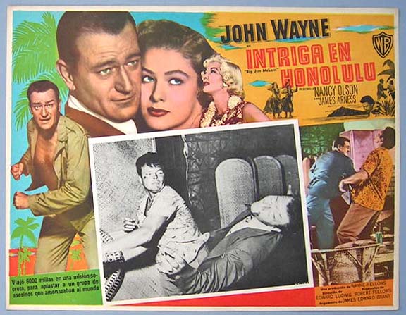 Beautiful Mexican jumbo lobby card (12.5x16.5") from the 1952 Warner Brothers action / G-Men film, BIG JIM MCLAIN, which starred John Wayne, Nancy Olson, James Arness, Alan Napier and Veda Ann Borg. $25 each |