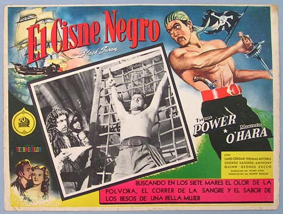 Beautiful Mexican jumbo lobby card (12.5x16.5") from the 1942 20th Century Fox adventure / romance film, THE BLACK SWAN, which starred Tyrone Power, Maureen O'Hara, Laird Cregar, Thomas Mitchell, George Sanders, Anthony Quinn and George Zucco. $25 each |