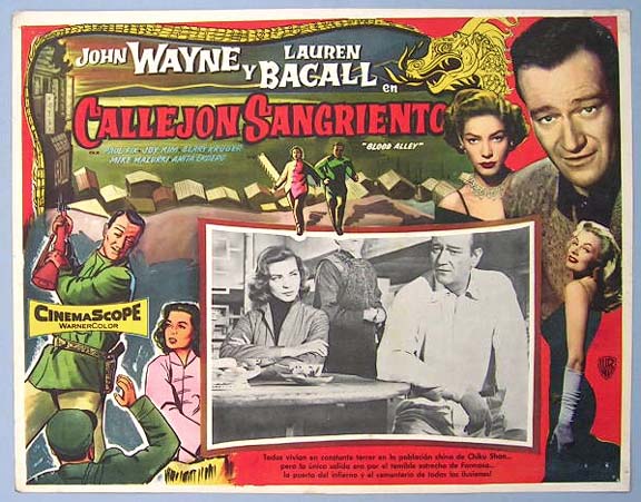 Beautiful Mexican jumbo lobby card (12.5x16.5") from the 1955 Warner Brothers action film, BLOOD ALLEY, which starred John Wayne, Lauren Bacall, Paul Fix, Joy Kim and Berry Kroeger. $20 each |