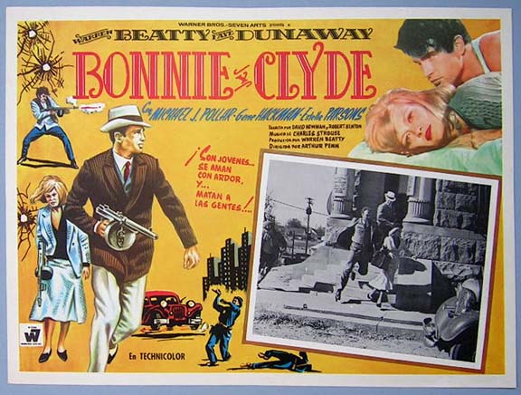 Beautiful Mexican jumbo lobby card (12x16") from the 1967 Warner Brothers crime film, BONNIE AND CLYDE, which starred Warren Beatty, Faye Dunaway, Michael J. Pollard, Gene Hackman and Estelle Parsons. $35 each |