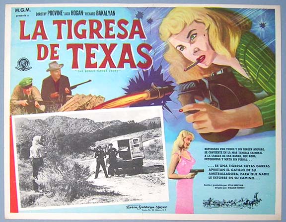 Beautiful Mexican jumbo lobby card (12.5x16.5") from the 1958 AIP crime / gangster film, BONNIE PARKER STORY, which starred Dorothy Provine, Jack Hogan, Richard Bakalyan, and Joe Turkel. $25 each |