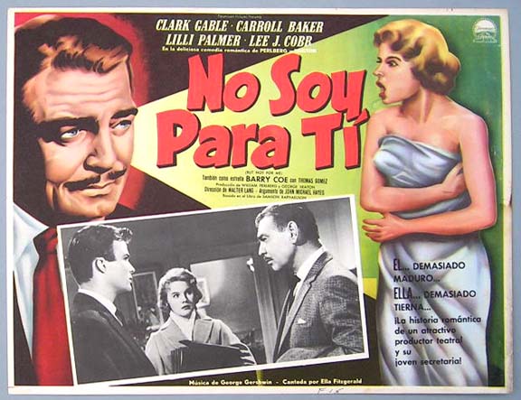 Beautiful Mexican jumbo lobby card (12.5x16.5") from the 1959 Paramount romantic comedy film, BUT NOT FOR ME, which starred Clark Gable, Carroll Baker, Lilli Palmer and Lee J. Cobb. $20 each |