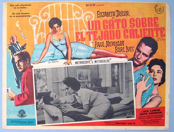 Beautiful Mexican jumbo lobby card (12.5x16.5") from the 1958 MGM drama film, CAT ON A HOT TIN ROOF, which starred Elizabeth Taylor, Paul Newman, Burl Ives, Jack Carson and Judith Anderson. $20 each |